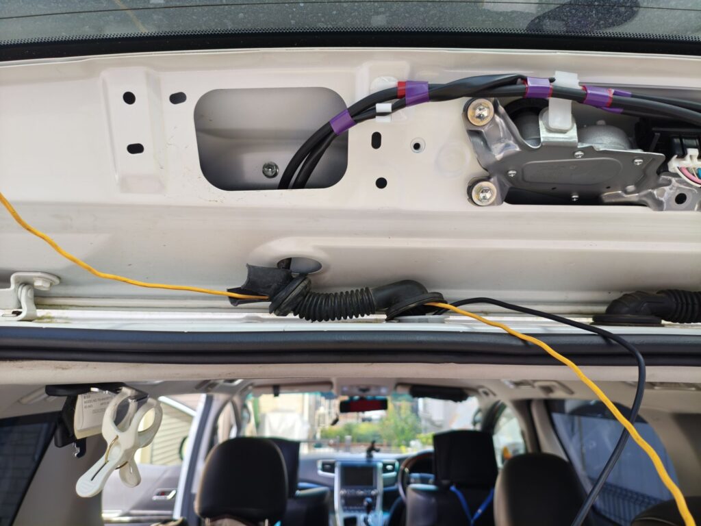 リアカメラの配線はリアゲートの防水ダクトの中に通します。