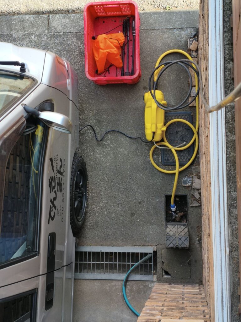 ケルヒャーの水圧で排水口の汚れを洗い流します。
