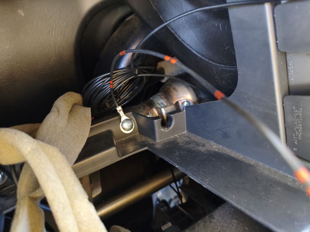 配線通しを使ってステアリングコラムの裏からマイクの配線を通します。